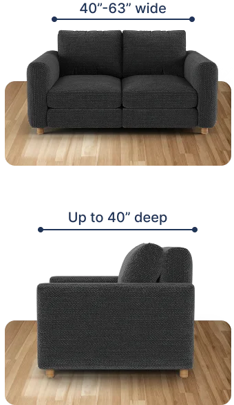 The fitting range for our loveseat covers is between 40" and 63". To ensure that our cover will fit your piece, the widest width of your loveseat should fall within this suggested fitting range. For our covers to perfectly work with your furniture, the following requirements should also be met: