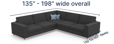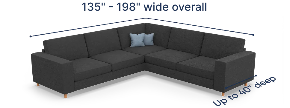 The fitting range for our corner sectional covers is between 135" and 208". To ensure that our cover will fit your piece, the total width of your corner should fall within this suggested fitting range. For our covers to perfectly work with your furniture, the following requirements should also be met: