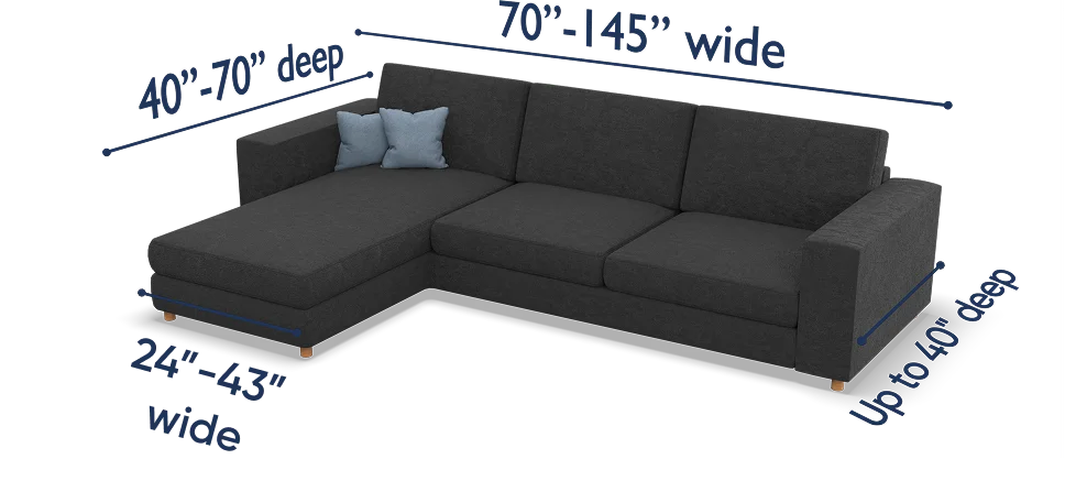 The fitting range for our L-shaped sofa covers is between 70" and 145" for width, 24" and 43" for chaise width, and 40" and 70" for chaise depth. To ensure that our cover will fit your piece, your measurements should fall within this suggested fitting range. For our covers to perfectly work with your furniture, the following requirements should also be met: